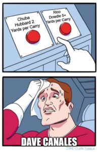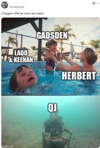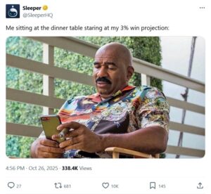 Higgins 147 – Bright 1s 105: Higgins and the Ladds didn’t let the MINUS SIX POINTS posted by the Commies’ D bother them, led by someone named Chimere Dike (34) and Drake Maye (27) while the 1s relied on Devon Achane (21) and the Eagles D (15). JSN’s bye week and Jayden Daniels’ continued injuries hobbled their efforts.